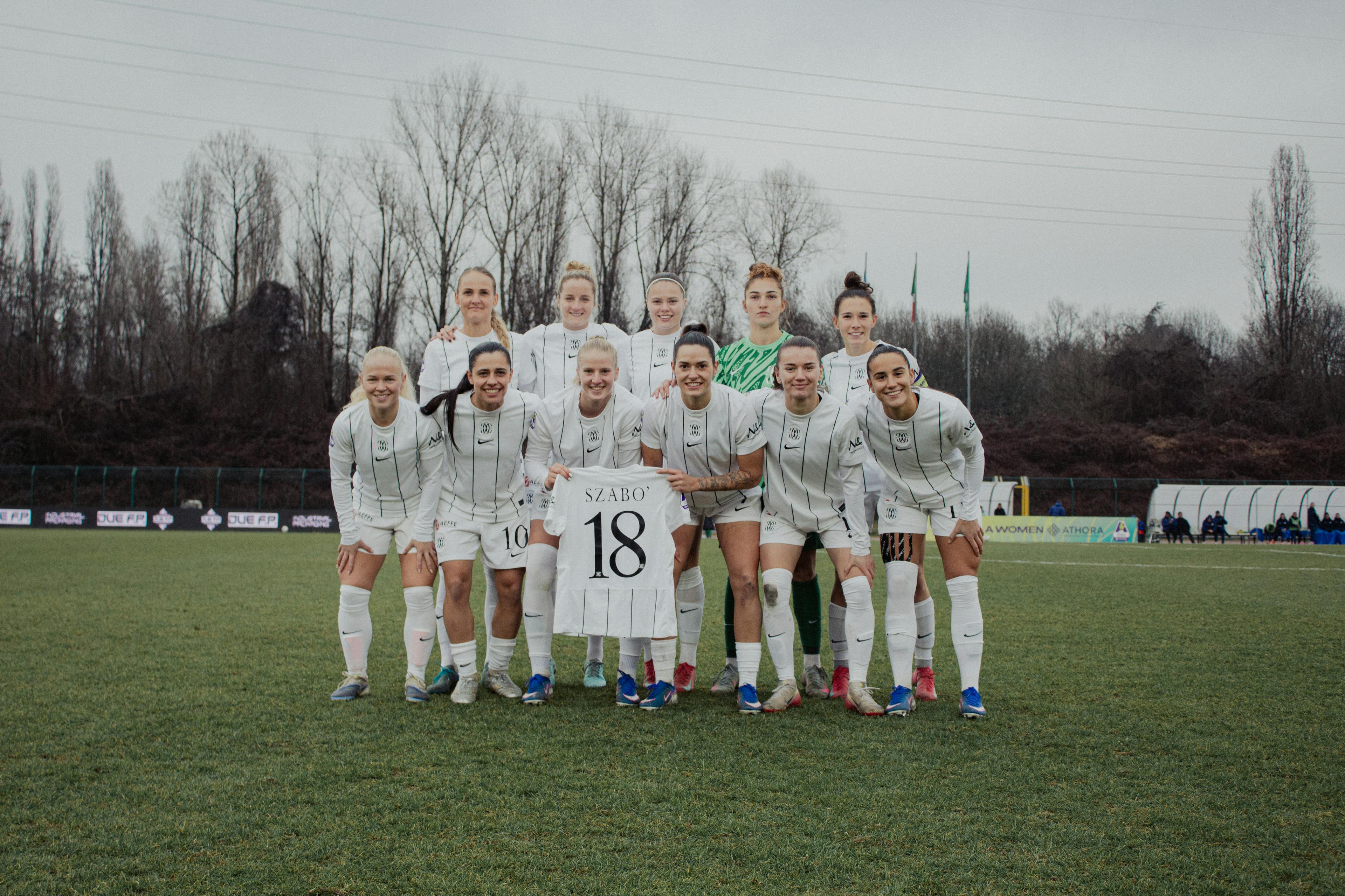 Prima del fischio d’inizio, davanti al pubblico di Meda, le undici titolari del Como Women hanno voluto dedicare un pensiero speciale alla compagna Viktoria Szabó, mostrando nella foto pre-partita la sua maglia numero 18, dopo il grave infortunio che l’ha colpita con la rottura del legamento crociato anteriore del ginocchio sinistro.