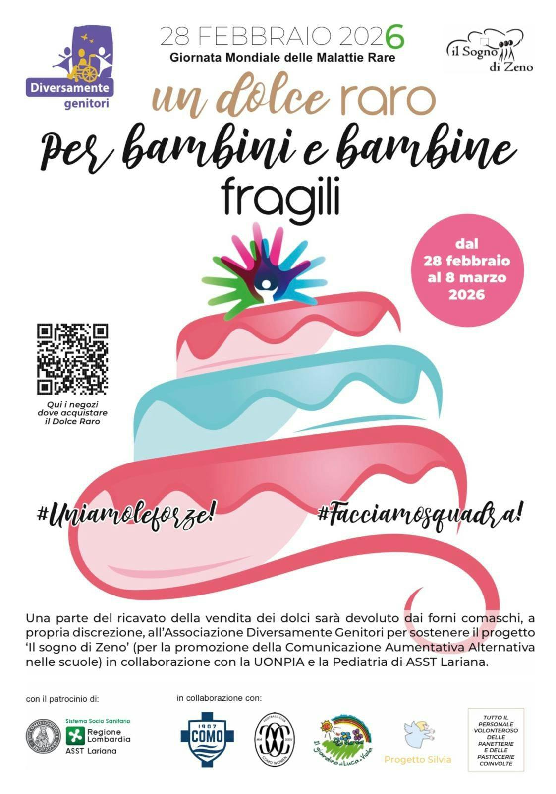 All’interno delle iniziative previste tra la fine di febbraio e il mese di marzo, il progetto “Un Dolce Raro” coinvolge alcune pasticcerie del territorio comasco, che realizzeranno e metteranno in vendita un dolce dedicato alla settimana delle malattie rare. L’iniziativa sarà attiva sul territorio dal 28 febbraio all’8 marzo 2026. Parte del ricavato sarà devoluto all’Associazione Diversamente Genitori, realtà attiva nel sostegno alle famiglie di bambine e bambini con fragilità.